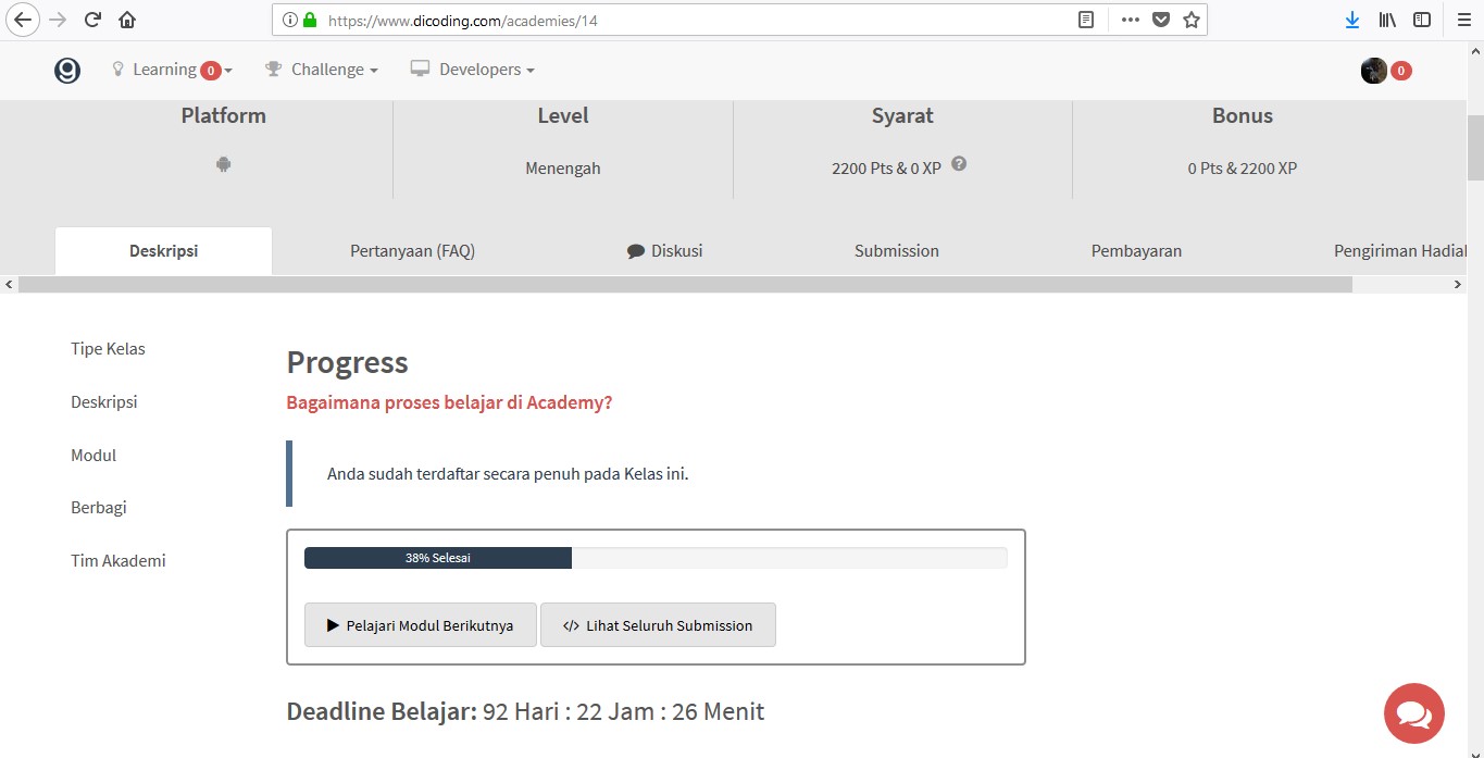 Setelah mengisi formulir yang diberikan, beberapa hari kemudian mendapatkan token untuk mengikuti tahapan-tahapan pembelajaran. Sampai dengan hari ini tanggal 14 September 2018 baru berhasil menyelesaikan pembelajaran 38% selama 7 (tujuh) hari.