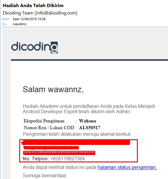 Setelah mendapatkan surel dengan isi Hadiah Akademi untuk pendaftaran Anda pada Kelas Menjadi Android Developer Expert telah dikirim oleh Admin.